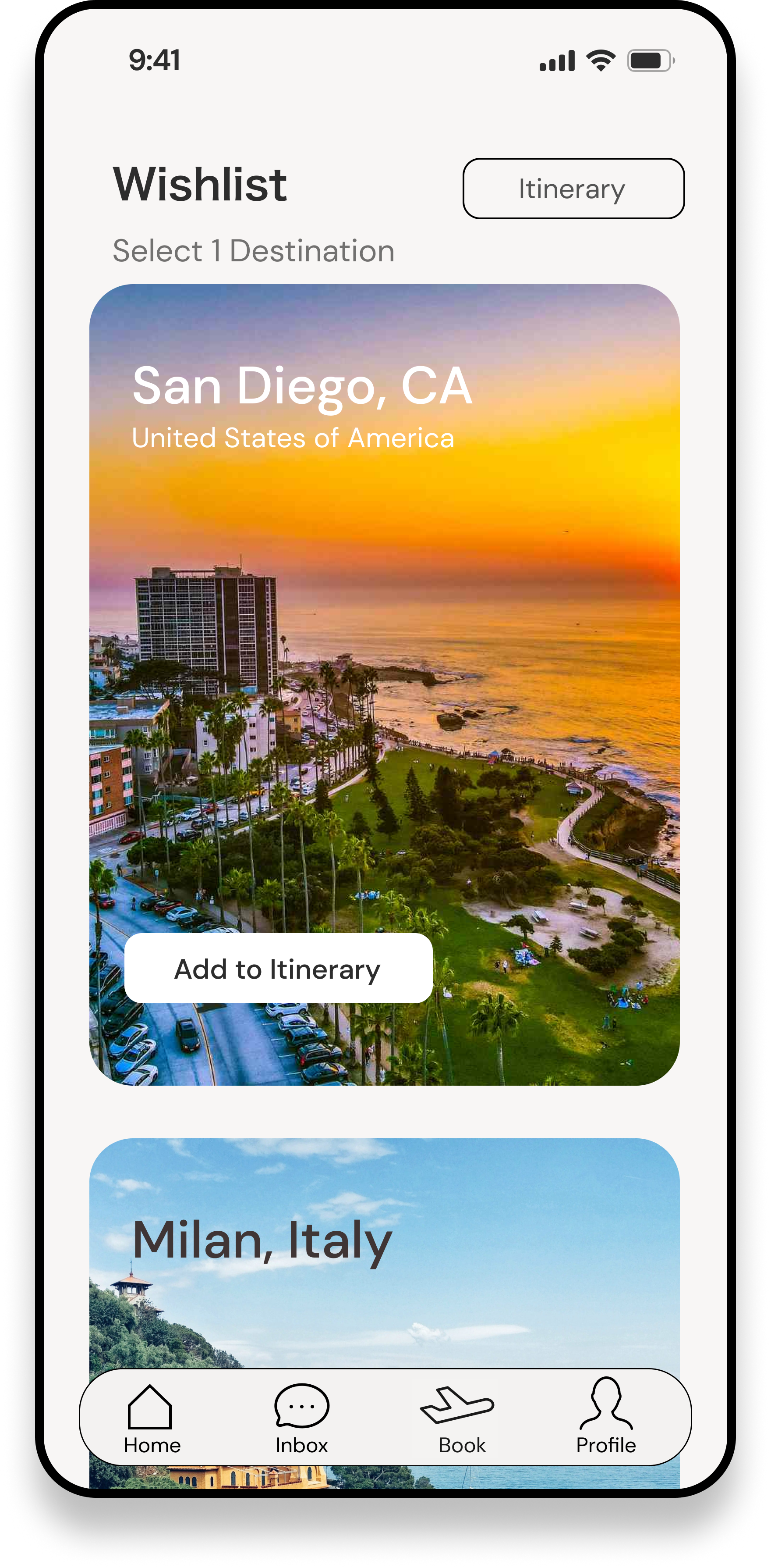 Using our swipe feature, explore different destinations and activities to add to your wish list. Once you book your flight and connect with a travel buddy, you may begin to add activities and begin planning your travel itinerary within the app.